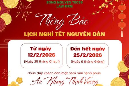 THÔNG BÁO LỊCH NGHỈ TẾT NGUYÊN ĐÁN NĂM 2026 Kính gửi: Quý Khách hàng và Quý đối tác Công ty Luật Song Nguyễn TECSS xin trân trọng thông báo đến Quý Khách hàng và Quý Đối tác lịch nghỉ Tết Nguyên đán 2026, cụ thể như sau: + Thời gian nghỉ lễ: Từ Thứ Năm, ngày 12/02/2026 (ngày 25 tháng Chạp) đến... Xem chi tiết
