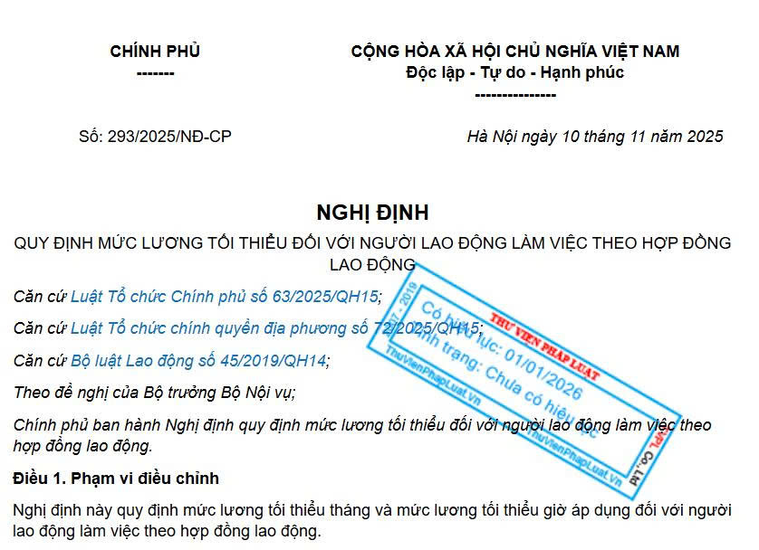 Ngày 10/11/2025, Chính phủ ban hành Nghị định số 293/2025/NĐ-CP quy định mức lương tối thiểu đối với người lao động làm việc theo hợp đồng lao động, có [...]